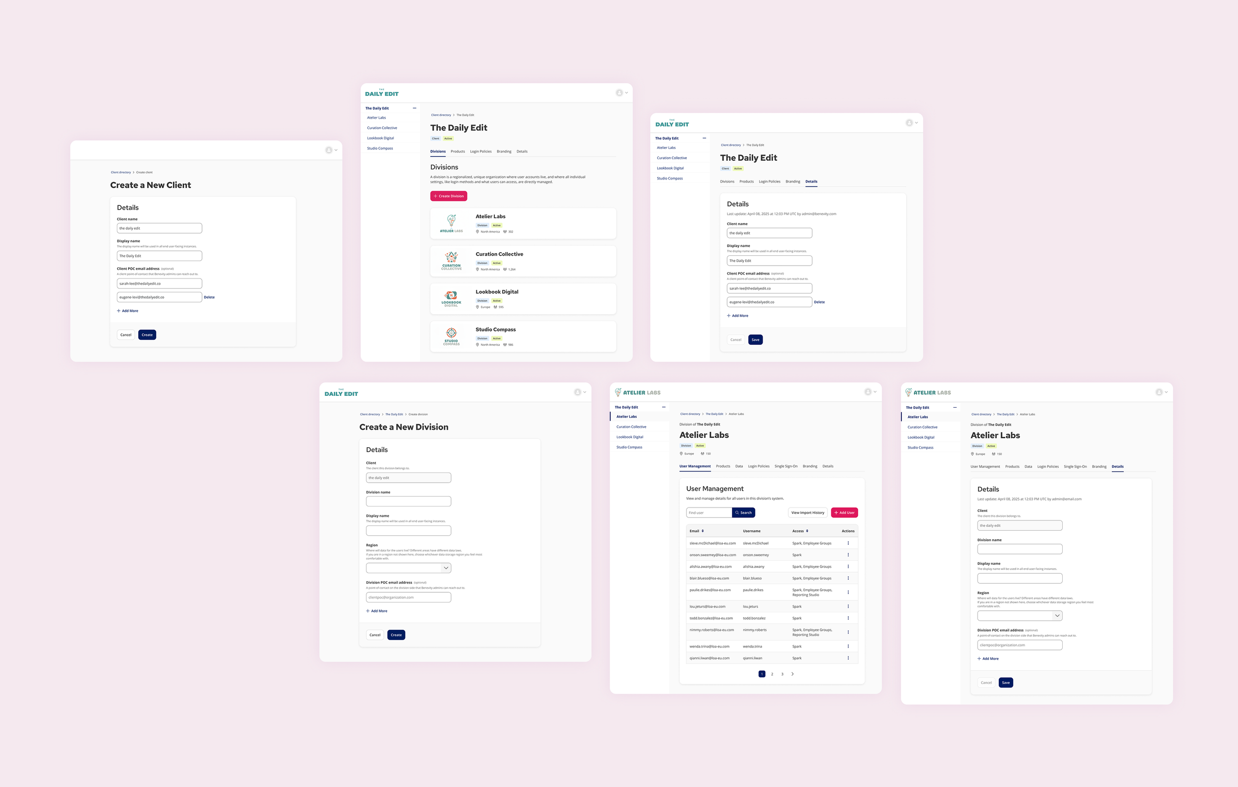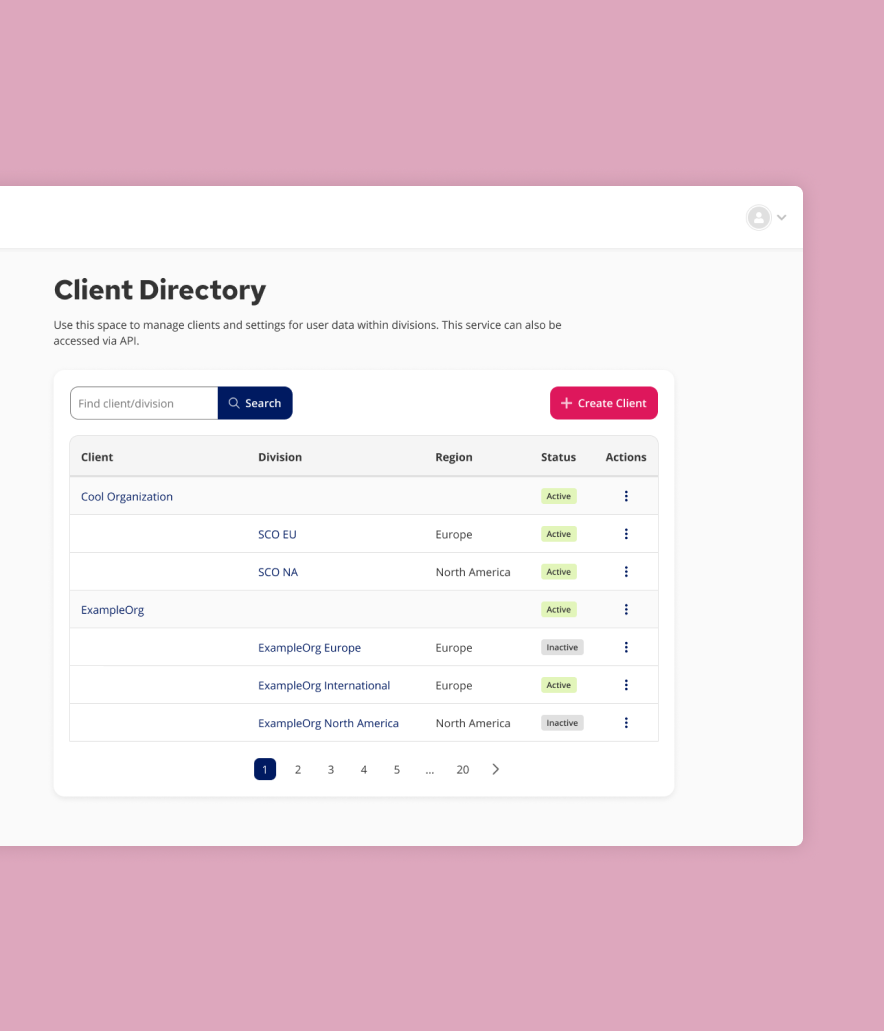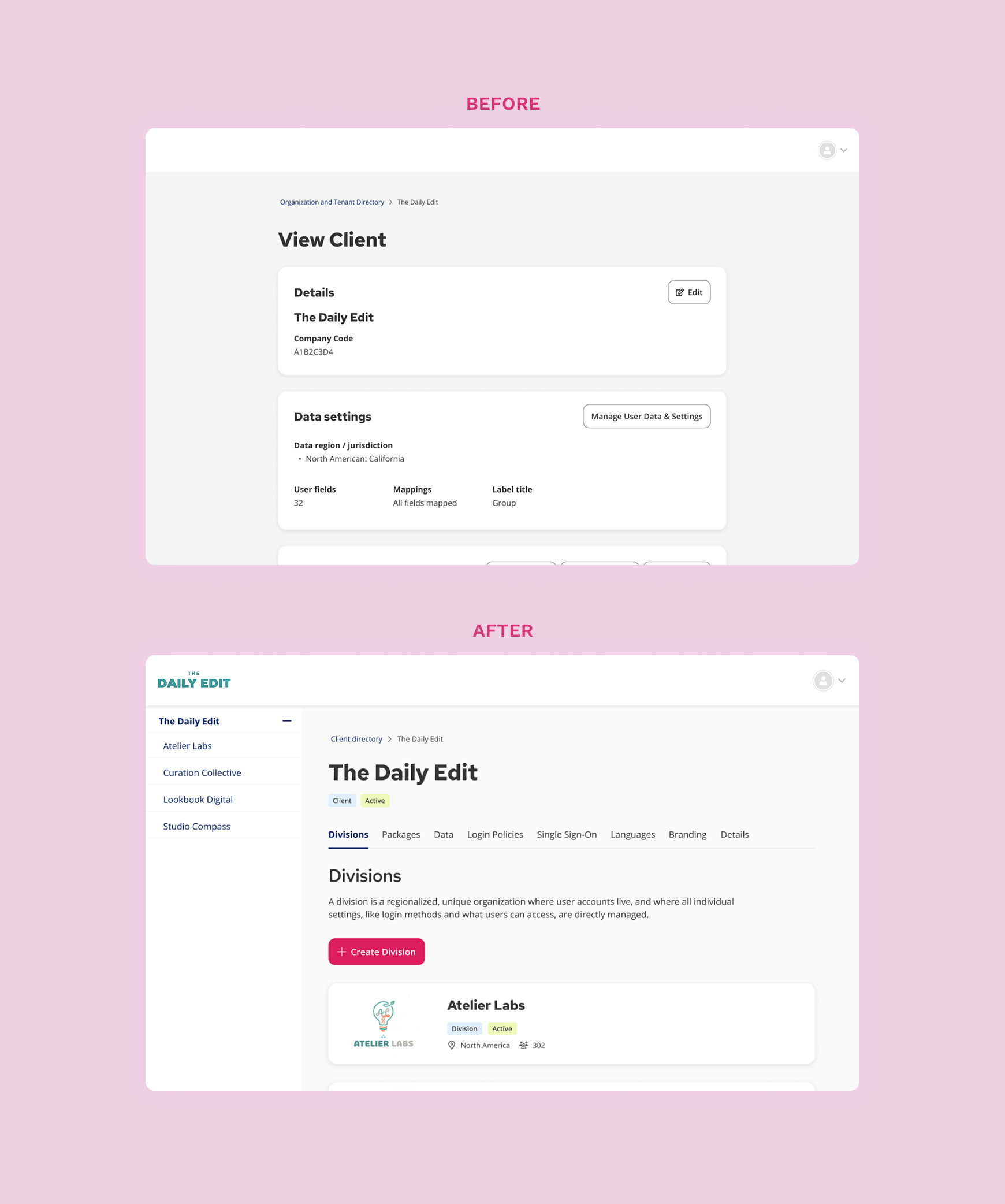 I led the iteration on the new navigational hierarchy and data visualization patterns. The primary goal was to clearly demonstrate the parent-child relationship between clients and divisions, and to provide intuitive workflows for global administration versus granular division-level actions.