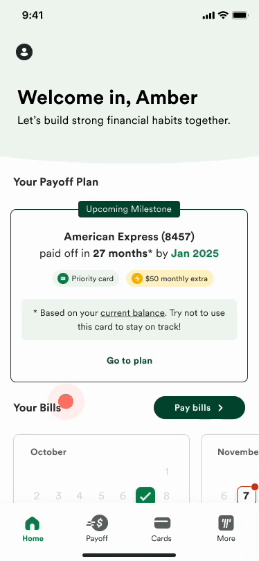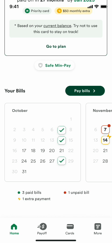 As a debt management app, it’s crucial that our users know when upcoming bills are due. On the dashboard, users can take a peek at what’s upcoming.