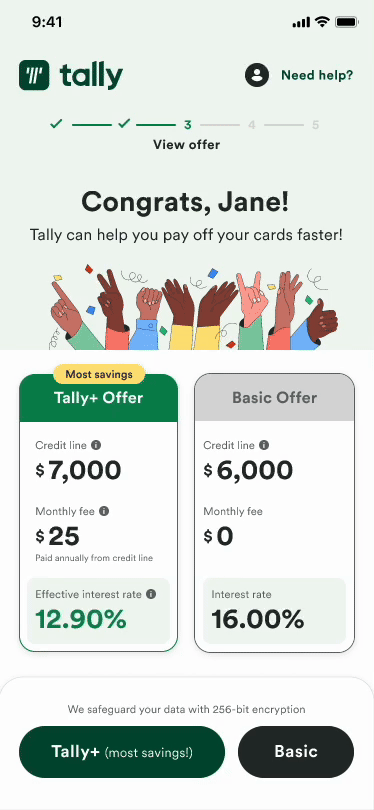 In the onboarding flow, a user must first enter personal information like their name, birthday, income, and address. A soft credit check is run to determine if the user is eligible for a Tally LOC. If they are, they are presented this offer screen to the right.