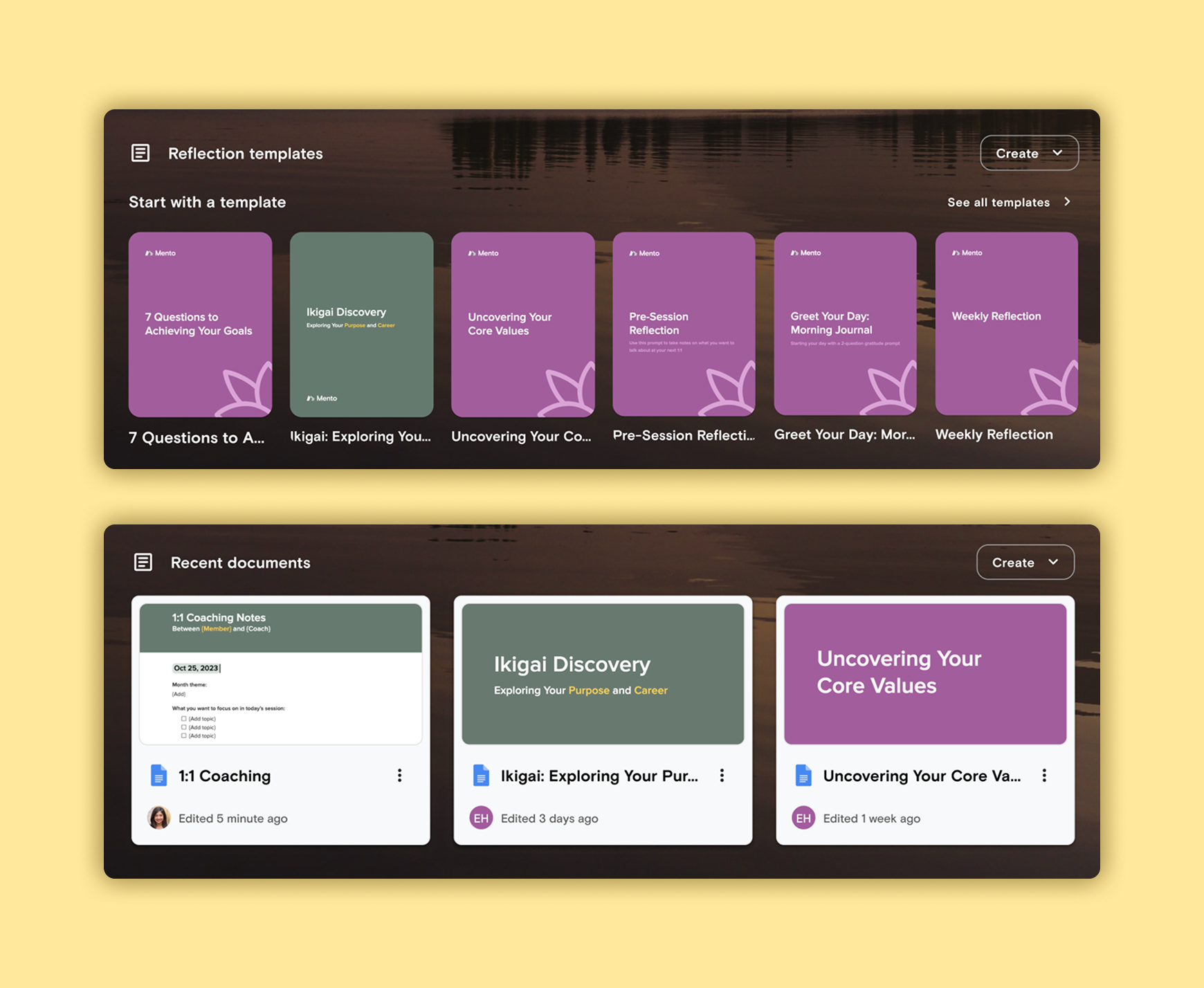Whether it’s a 1:1 document shared with your coach or a self-guided reflection, easily access your most recent documents.