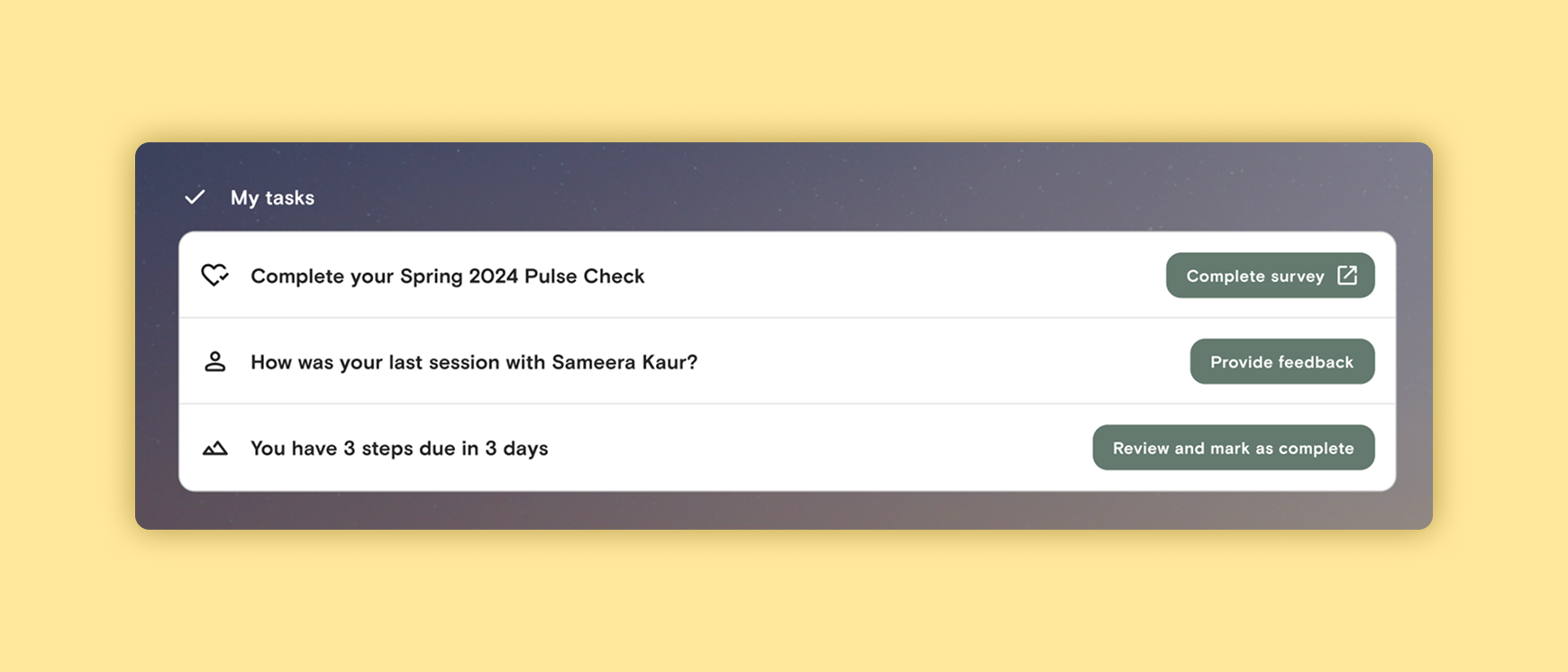 Find tasks and notifications that require attention here, from upcoming Growth Plan steps to reminding you to book another coaching session.