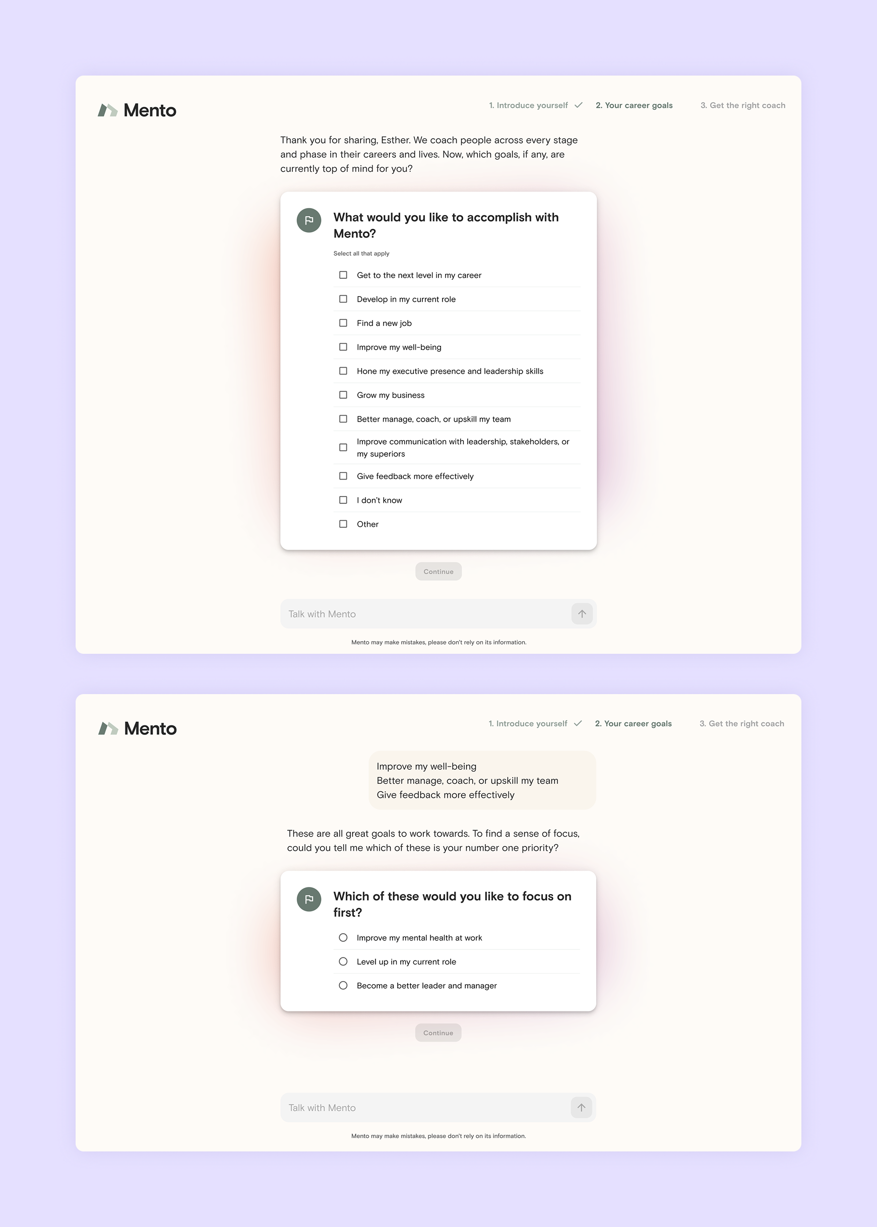 With the release of Mento AI, I brought the conversational UI to the signup flow in hopes to prime members that coaching happens with conversations with oneself or their coach.